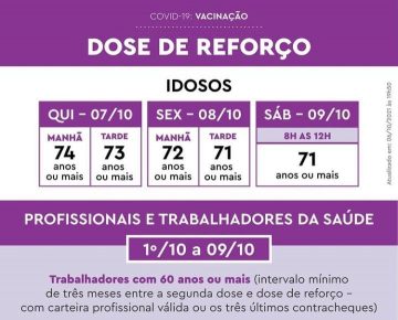 Na sexta-feira (08/10), a vacina será destinada a pessoas com 72 anos ou mais de manhã e 71 anos ou mais à tarde.