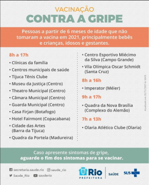 Os locais de vacinação podem ser consultados em prefeitura.rio/ondeseratendido.