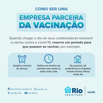 Os materiais da campanha estão disponíveis no site coronavirus.rio e consistem em: folder digital com instruções sobre como uma empresa pode ajudar na vacinação, com sugestão de reservar um período do expediente para os colaboradores se vacinarem, além de cartazes explicativos, cards para e-mail e WhatsApp e o selo “Empresa Parceira da Vacinação”, que pode ser utilizado por todas as instituições que participarem da iniciativa.