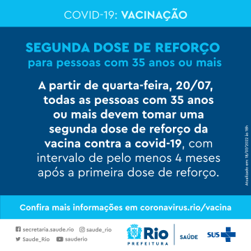 A vacinação contra a Covid-19 de crianças de 6 meses a 4 anos será prorrogada outra vez - Arquivo/Prefeitura do Rio A partir desta quarta-feira (20/7), todas as pessoas com 35 anos ou mais poderão receber a segunda dose de reforço (DR2) da vacina contra a Covid-19, desde que já tenham passado quatro meses ou mais da aplicação da primeira dose de reforço (DR).