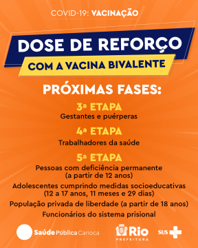 A Secretaria Municipal de Saúde do Rio avança, a partir desta segunda-feira (6/3),  para a segunda etapa de aplicação da vacina Pfizer bivalente contra a covid-19 em grupos prioritários, para pessoas com 68 anos ou mais. A campanha segue de forma escalonada até os 60 anos, na sexta-feira (10/3). A vacinação continua para pessoas com 12 anos imunocomprometidas.