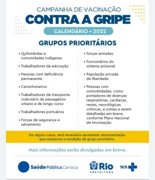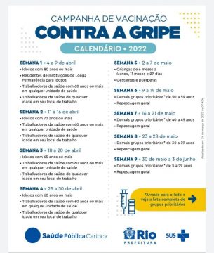 A campanha de vacinação contra a gripe começa com os grupos prioritários - Edu Kapps/Prefeitura do Rio                  A campanha de vacinação contra a influenza no município do Rio teve início nesta segunda-feira (04/04) com a meta de alcançar a cobertura de 90% dos grupos prioritários, o que corresponde a cerca de 1,8 milhão de pessoas na cidade. O cronograma de vacinação será escalonado entre os diversos grupos elencados para a campanha. Os primeiros atendidos serão os idosos acima de 80 anos (que no mesmo dia poderão tomar também a segunda dose de reforço da vacina da Covid-19), os que residem em instituições de longa permanência para idosos (ILPIs) e os trabalhadores da saúde com 60 anos ou mais.