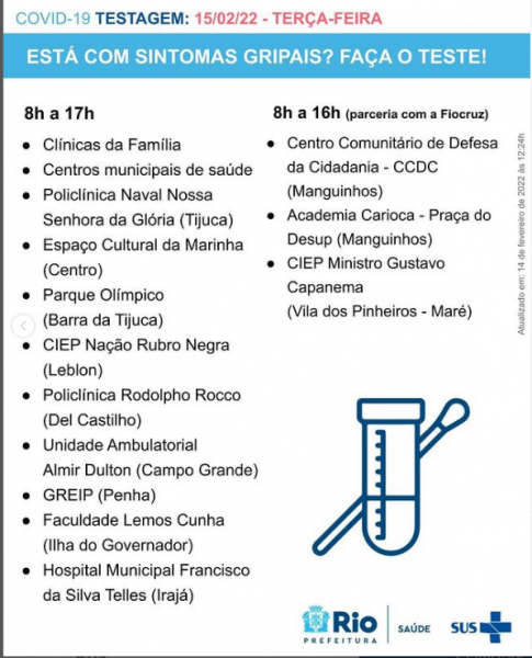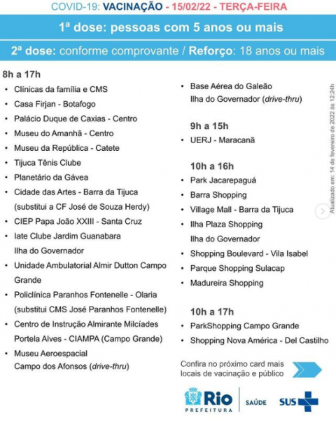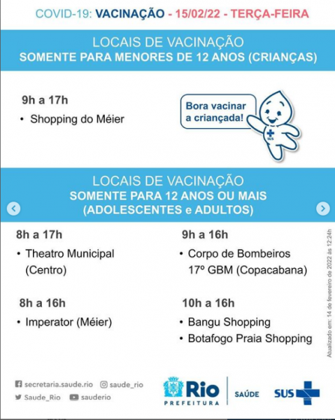 A vacinação contra a Covid-19 de crianças de 6 meses a 4 anos será prorrogada outra vez - Arquivo/Prefeitura do Rio                  Atenção aos locais e horários da vacinação contra Covid-19 e dos centros de atendimento a pacientes com sintomas gripais nesta terça-feira (15/2).