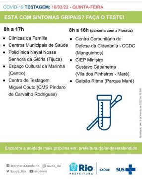 Devem procurar os postos para testagem pessoas com sintomas como febre, calafrio, tosse, coriza, dor de garganta, dor de cabeça e alterações no olfato e/ou paladar.