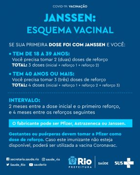 Seguindo orientações do Ministério da Saúde, pessoas com 40 anos ou mais que tomaram a dose única da Janssen como esquema primário da vacinação contra Covid-19 deverão receber uma terceira dose de reforço (DR3).