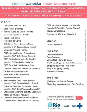 A primeira dose é destinada às meninas com 5 anos e às crianças de 5 a 11 anos com deficiência e/ou comorbidades. A aplicação da dose de reforço (DR) continua para pessoas com 18 anos ou mais que tomaram a segunda dose há 4 meses ou mais. As unidades seguem aplicando a primeira dose da vacina contra Covid-19 em maiores de 12 anos e a segunda dose, considerando o intervalo a partir da data da primeira aplicação.