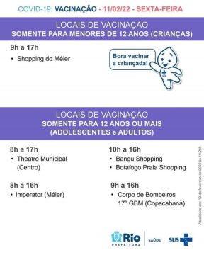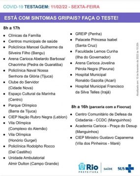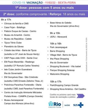 Boletim mostra que os casos confirmados de Covid-19 se mantêm em queda - Arquivo/Prefeitura do Rio A população deve ficar atenta aos locais e horários de funcionamento dos postos de vacinação contra a Covid-19 e dos centros de atendimento a pacientes com sintomas gripais nesta sexta-feira (11/02).