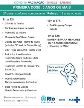 Vacinação no Rio - Divulgação / Prefeitura do Rio Todas as pessoas com 5 anos ou mais podem receber a primeira dose da vacina contra a Covid-19 neste sábado (05/03).