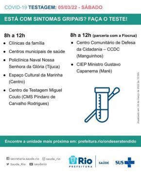 Devem procurar os postos para testagem pessoas com sintomas como febre, calafrio, tosse, coriza, dor de garganta, dor de cabeça e alterações no olfato e/ou paladar.