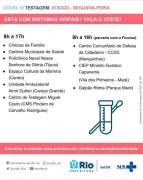 Devem procurar os postos para testagem pessoas com sintomas como febre, calafrio, tosse, coriza, dor de garganta, dor de cabeça e alterações no olfato e/ou paladar.