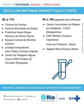 Devem procurar os postos para testagem pessoas com sintomas como febre, calafrio, tosse, coriza, dor de garganta, dor de cabeça e alterações no olfato e/ou paladar.