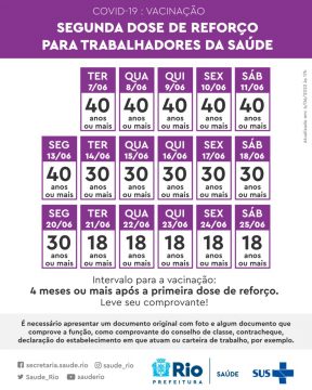 Vacinação contra a Covid-19 - Marcos de Paula/Prefeitura do Rio A partir desta terça-feira (07/06), trabalhadores da saúde de 40 anos ou mais já podem tomar a segunda dose de reforço da vacina contra a Covid-19. Na faixa etária com 30 anos ou mais, a imunização será a partir de 14 de junho e os trabalhadores com 18 anos ou mais podem se vacinar a partir de 21 de junho.