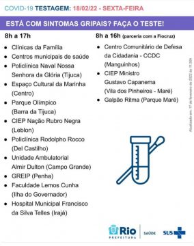 Devem procurar os postos para testagem pessoas com sintomas como febre, calafrio, tosse, coriza, dor de garganta, dor de cabeça e alterações no olfato e/ou paladar.