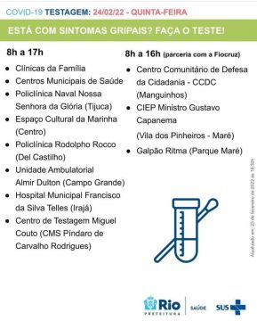 Devem procurar os postos para testagem pessoas com sintomas como febre, calafrio, tosse, coriza, dor de garganta, dor de cabeça e alterações no olfato e/ou paladar.