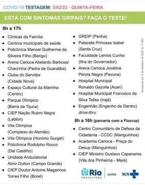 Paciente aguarda resultado de teste da Covid-19 - Alexandre Macieira / Prefeitura do Rio A população deve ficar atenta aos locais e horários de funcionamento dos postos de vacinação contra a Covid-19 e dos centros de atendimento a pacientes com sintomas gripais nesta quinta-feira (03/02).