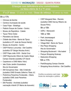 Poderão receber a primeira dose crianças de 5 a 11 anos com deficiência e/ou comorbidades e pessoas com 12 anos ou mais que não foram vacinadas contra a Covid-19 até o momento. Pessoas com 18 anos ou mais que tomaram a segunda dose há 4 meses ou mais podem receber a dose de reforço.