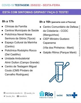 Devem procurar os postos para testagem pessoas com sintomas como febre, calafrio, tosse, coriza, dor de garganta, dor de cabeça e alterações no olfato e/ou paladar.