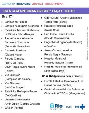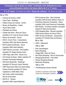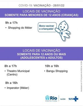 Vacinação infantil contra a Covid-19 - Fabio Motta / Prefeitura do Rio A população deve ficar atenta aos locais e horários de funcionamento dos postos de vacinação contra a Covid-19 e dos centros de atendimento a pacientes com sintomas gripais nesta sexta-feira (28/01).