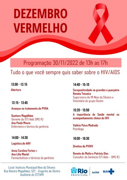Publicado em 28/11/2022 - 11:24 | AtualizadoNesta quarta-feira (30/11), a Secretaria Municipal de Saúde (SMS) realiza uma programação especial no Instituto Municipal Nise da Silveira, no Engenho de Dentro, dando início à campanha do Dezembro Vermelho, o mês de conscientização e combate à AIDS. Haverá palestras com médicos, infectologistas e psicólogos falando sobre o HIV e a importância da informação para a prevenção e a quebra de estigmas. A abertura do evento será às 13h, no auditório da CETAPE, com entrada totalmente gratuita.