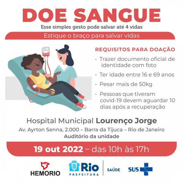 Doação de sangue no Lourenço Jorge - Edu Kapps / Prefeitura do Rio O Hospital Municipal Lourenço Jorge, na Barra da Tijuca, promove, na próxima quarta-feira (19/10), das 10h às 17h, mais uma campanha de doação de sangue. O objetivo da ação é reforçar o banco de sangue do Hemorio, que fornece hemoderivados para mais de 200 hospitais da rede pública do Rio de Janeiro, principalmente para emergências, e está com os estoques em nível crítico.