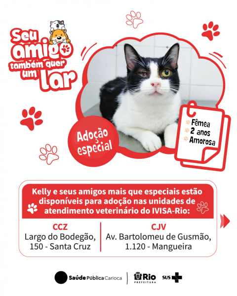 Além dos animais especiais, as unidades de atendimento veterinário do IVISA-Rio têm diversos cães e gatos à espera de um lar. O processo de adoção pode ser feito de segunda a sexta-feira, das 9h às 16h, no Centro de Medicina Veterinária Jorge Vaitsman (Avenida Bartolomeu de Gusmão, 1.120, Mangueira) ou no Hospital Veterinário do Centro de Controle de Zoonoses Paulo Dacorso Filho (Largo do Bodegão, 150, Santa Cruz).