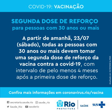 Em algumas áreas, o incremento de cobertura vacinal foi de mais de 20% - Marcos de Paula / Prefeitura do Rio A Secretaria Municipal de Saúde informa que, a partir deste sábado (23/7), todas as pessoas com 30 anos ou mais poderão receber a segunda dose de reforço (DR2) da vacina contra a Covid-19. O intervalo é de quatro meses ou mais da aplicação da primeira dose de reforço (DR). Para ser vacinado, basta apresentar documento de identidade com CPF e comprovante de vacinação.