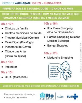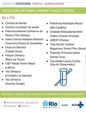Testagem para a Covid-19 - Edu Kapps / Prefeitura do Rio A Secretaria Municipal de Saúde informa os locais e horários de funcionamento dos postos de vacinação contra a Covid-19 e dos centros de atendimento a pacientes com sintomas gripais nesta quinta-feira (13/01), conforme imagens publicadas abaixo.