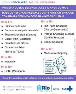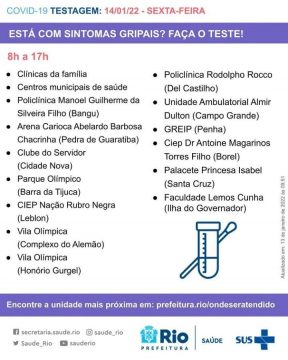 Polo de testagem para Covid-19 - Fernando Silva / Prefeitura do Rio A Secretaria Municipal de Saúde informa os locais e horários de funcionamento dos postos de vacinação contra a Covid-19 e dos centros de atendimento a pacientes com sintomas gripais nesta sexta-feira (14/01), conforme imagens publicadas abaixo.