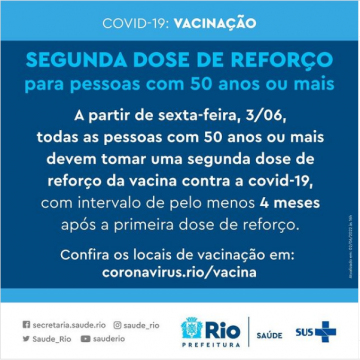 Vacinação contra a Covid-19 - Marcelo Piu / Prefeitura do Rio A Prefeitura do Rio, por meio da Secretaria de Saúde, informa que, a partir desta sexta-feira (3/6), quem tem 50 anos ou mais deverá receber uma segunda dose de reforço contra a Covid-19 para completar seu esquema vacinal.