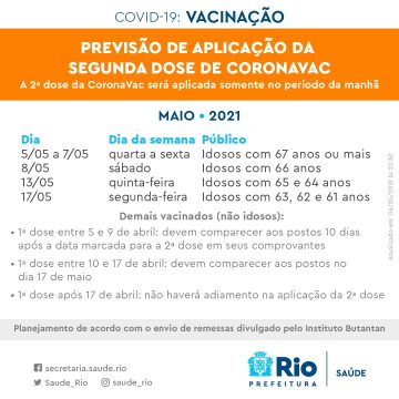 O planejamento foi desenvolvido de acordo com a previsão de envio de remessas da vacina divulgada pelo Instituto Butantan. Mais informações sobre o calendário de vacinação estão disponíveis no site coronavirus.rio/vacina.