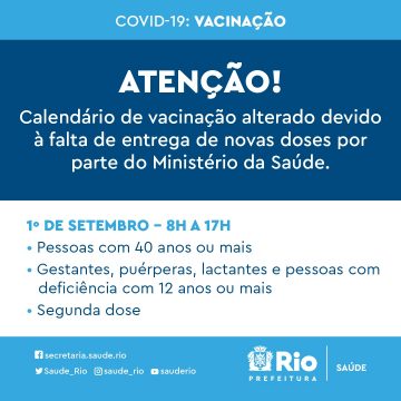 Vacinação contra a Covid-19 - Fabio Motta / Prefeitura do Rio A Prefeitura do Rio informa que ocorreu uma mudança no calendário de vacinação contra a Covid-19 nesta quarta-feira (01/09). Devido à falta de entrega de novas doses por parte do Ministério da Saúde, serão imunizadas pessoas com 40 anos ou mais, gestantes, puérperas, lactantes e pessoas com deficiência com 12 anos ou mais.