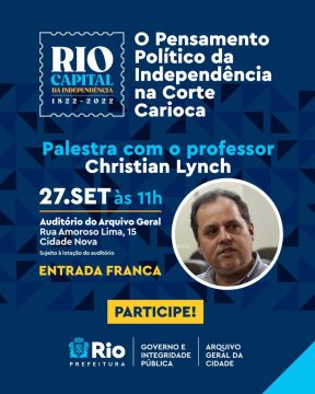 O Arquivo Geral da Cidade recebe, nesta terça-feira (27/9), às 11h, a palestra de Christian Lynch, doutor em Ciência Política, que vai analisar o papel e a importância da cidade do Rio de Janeiro no processo de Independência do Brasil, assim como aspectos ligados à sua histórica capitalidade e à formação do pensamento político brasileiro. A palestra é mais uma ação desenvolvida pelo Arquivo Geral na promoção da memória e do protagonismo do Rio nos movimentos que culminaram com a Independência.