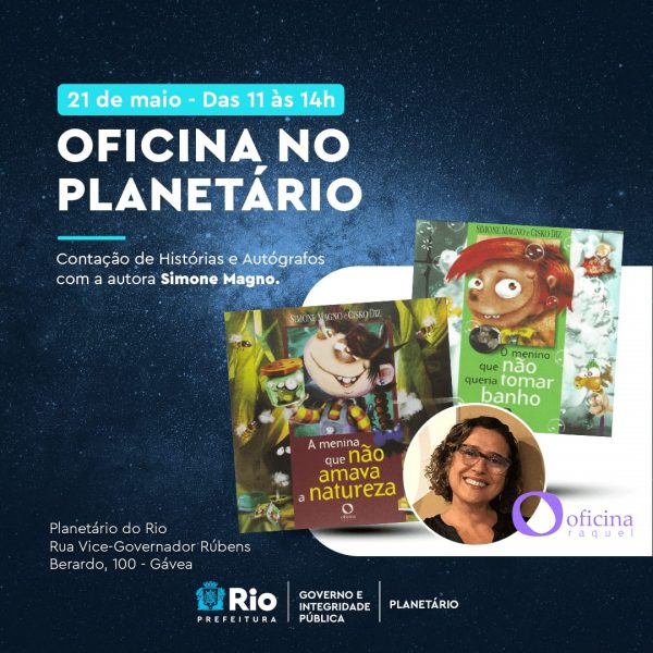 O Planetário do Rio - Divulgação O Planetário do Rio, em parceria com a editora Oficina Raquel, apresenta a segunda edição do projeto Oficina no Planetário, composto por várias atividades para todos os públicos. O evento ocorrerá na área da sala de leitura, anexa ao Hall da Astronomia no térreo, neste sábado (21/5), das 11h às 14h. A autora Simone Magno contará histórias para os visitantes e irá autografar os seus livros.