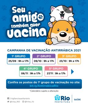 Marcelo Piu / Prefeitura do Rio A Secretaria Municipal de Saúde (SMS), por meio do Instituto Municipal de Vigilância Sanitária, Vigilância de Zoonoses e de Inspeção Agropecuária (Ivisa), inicia neste sábado (25/09) a campanha de vacinação antirrábica de cães e gatos. Até 27 de novembro, a ação contemplará todos os bairros da cidade, divididos em cinco grupos de forma escalonada, sendo uma região a cada data do calendário. A meta da SMS é imunizar 80% dos cães e gatos estimados no município, como preconizam a OMS e o Ministério da Saúde, totalizando cerca de 670 mil animais.
